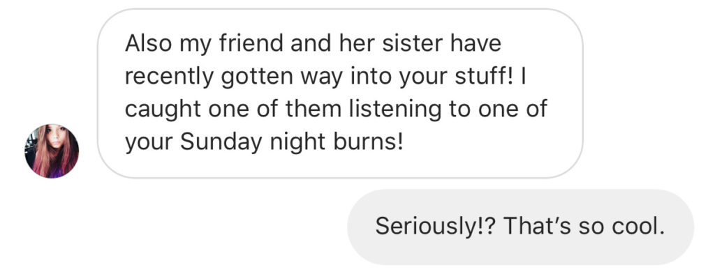 Anyway. That was the coolest thing I have heard in a very long time. What an awesome audience! To think that my daughter’s friends are a fan of my work? That really inspires me to step up my game and give them the very best I can possibly channel and come up with.