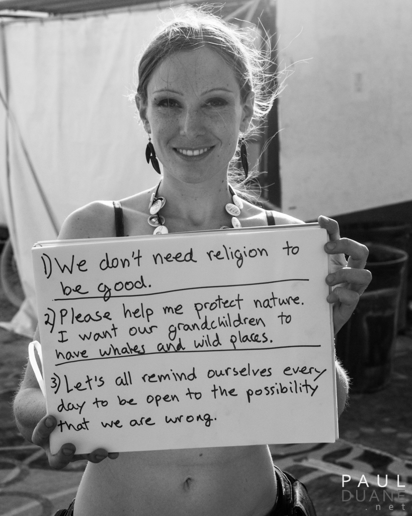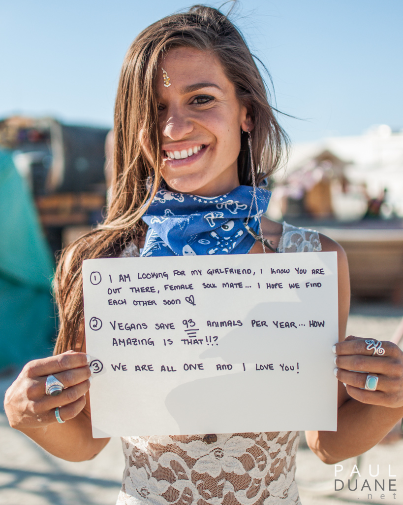 Zom Bee, your thoughts are so poisoned by self-loathing and a pernicious us vs them mentality that your eyes can’t actually see. Look at the people in the portraits: do you actually see nothing but sparkleponies? I’m not going to single any of the people in the portraits out (as the beauty of their messages is the important part, not their looks) but I think it safe to say that quite a few didn’t come from the media-promoted molds of “beauty”, much less the Burner art-car sparklepony set (which is another can of worms entirely, and not nearly as simple an issue as your comment makes it out to be).
