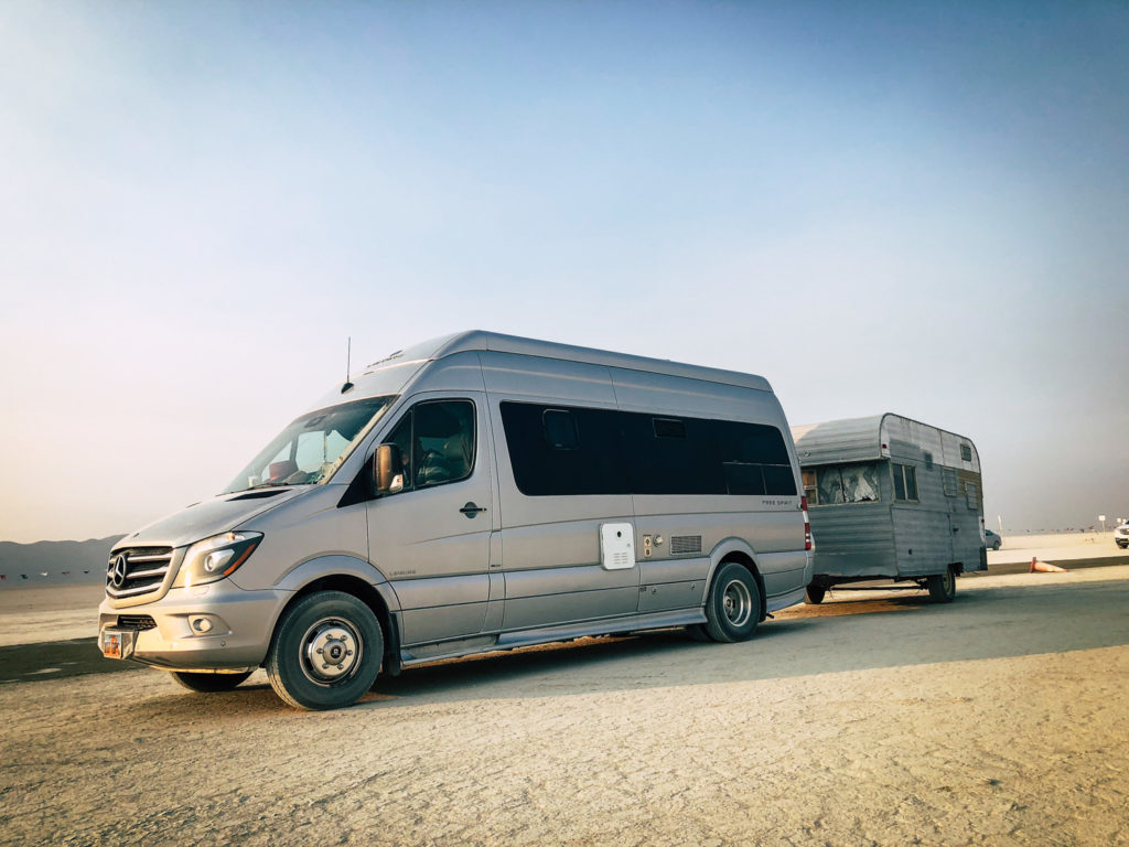 The Duane Desert Domicile is a 1967 Fireball 16’ trailer. The wood in the walls is rotting, the electrical doesn’t work, and the bench / foldout bed on one end is broken and barely sleepable. Three cases of booze from Ogden’s Own Distillery and two cases of Mexican beers block the small stove. My armpit itches – as my fingers return from scratching, I notice one of the many miracles of the playa: they don’t stink. I haven’t had s shower since Thursday. This is one of the many mysteries of the Playa. Some really groovy, atmospheric electronica plays from a bluetooth speaker via my iPhone. I’m nearing the end of my third cup of coffee from Alysson. The trailer is shaking from the gusts of wind outside. Forecast yesterday was for gusts up to 70mph, today’s forecast seems to have been modified for something closer tot 20mph, for which I am grateful. 70mph winds out here would be near catastrophic. I can taste playa dust in the air inside the camper right now, indicating that a sizable dust storm is materializing outside. I am content as I’ve ever been in this moment – being able to pull out my laptop and sit at a real table and write, in the midst of these most unhospitable fo conditions. The sound of air compressors, generators, and the occasional throbbing bass from a nearby sound system adorns the otherwise austere quietude of the desert. “Just Hang On Beautiful One” by AU4 soars through the trailer as I write. My heart is full and complete and calm and happy in this Mecca of creativity. I’m grateful for this space to write every morning, to keep up my routine that is so central to me being a creative being, here, in this most wild and wonderful and sacred of spaces.