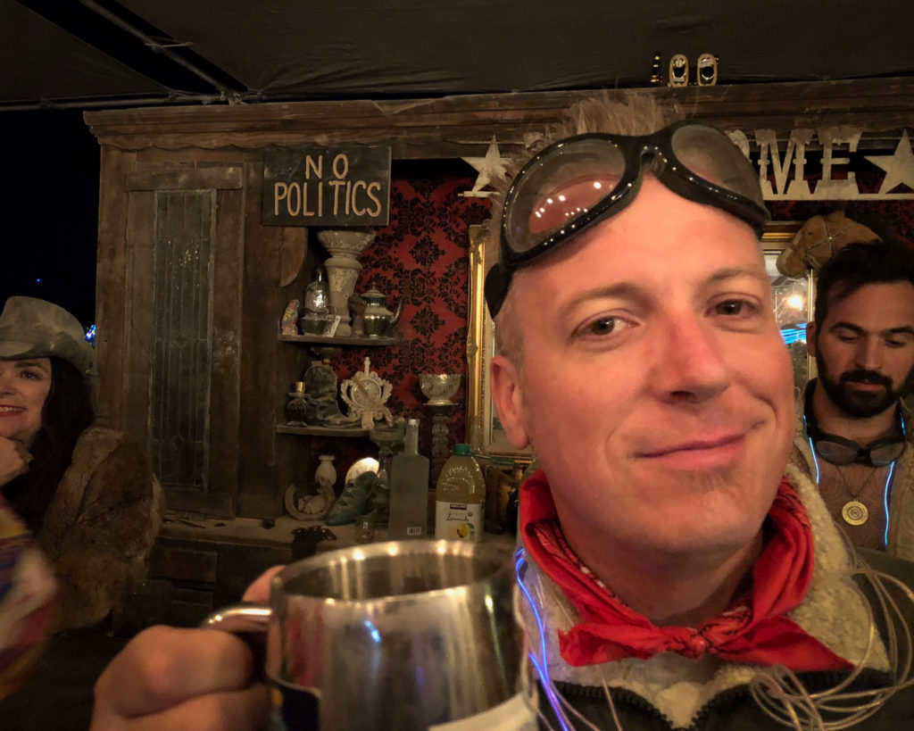 10pm – I go looking for Chase to check in about finishing our work on A street. I end up hanging out with Aaron Billingsley and talking about food. He taught me some cool things about sous vi de cooking. We nerded out over the finer points of cooking well. It felt really good to be having a good, respectful conversation with Aaron. This is not always the case. I’m not sure who changed – me, or him, but it’s really nice and chill now. Sarah offers up a vape pen, Aaron offers bourbon, and after a few hits of each, I’m high as a kite. OF COURSE, not long after that, I have more placements to do. Of course, this new addition to our village needs to leave early and my original design had her boxed in. Thank god I left some extra spaces on the RV lane to work with. Nice job on the foresight, bro. We used it. They were thrilled, they are placed perfectly, and somehow, I was able to not only rework the layout while high as a fucking kite, I was able to direct her trailer maneuvers with total precision. I’m again astounded at how good I really am under the influence. The secret is to just slow down, take on step at a time, and think things through logically. Don’t panic. You aren’t as high as you think you are. This is the mantra.