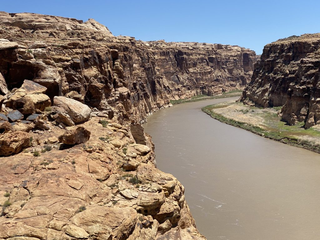 Option #3 was the winner, and I was off on my way onto a perfectly maintained road with lots of hills, dips, and perfect curves, winding through open cattle grazing country. Soon the road found it’s way to the Colorado River and begin running alongside it through breathtaking red rock canyons, all the way to Moab.