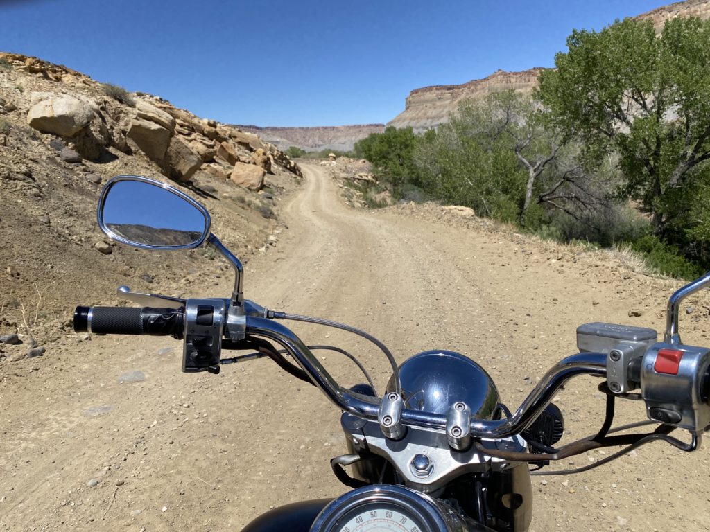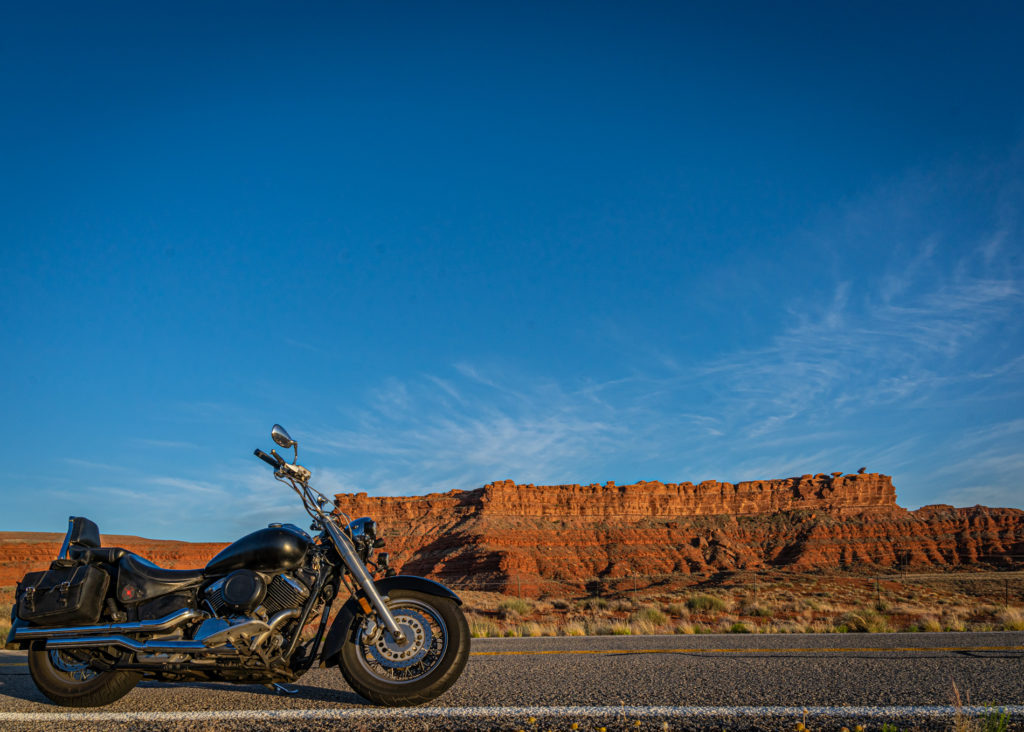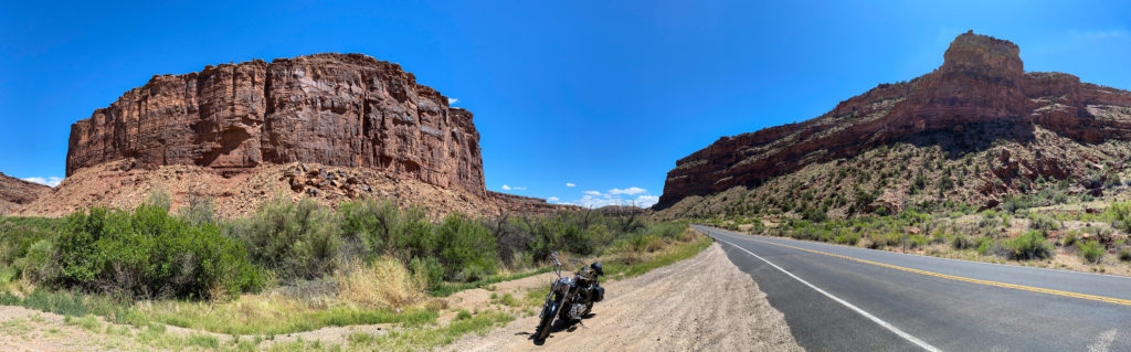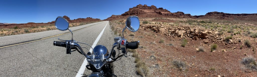 The ride to, and the town of Blanding, all live up to their name. Bland. Miles and miles of flat, dull green / grey sagebrush and scrub oak. Once I finally arrived in Blanding, I had my final bout with the Harley Davidson app that I’d been using for navigation. It tried very hard to send me in the opposite direction of my motel. Blanding only has a couple of streets and it only took me a couple of minutes to locate my motel just by driving around. I checked in, took a few minutes to rest and refresh, and then set out for Valley of the Gods.
