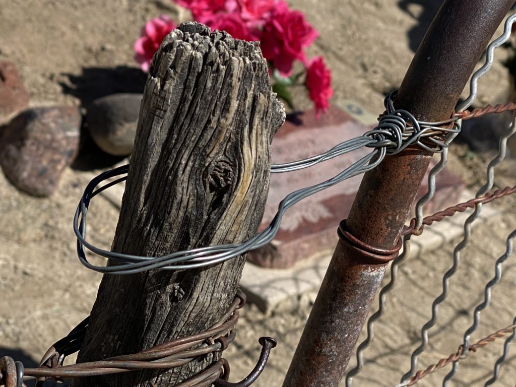 Finally, success. The Caineville Cemetery is a small plot of land encircled by a makeshift chicken wire fence. There are no more than a dozen graves -some of the graves are pioneer era graves, a couple are fresh, within a couple of years.