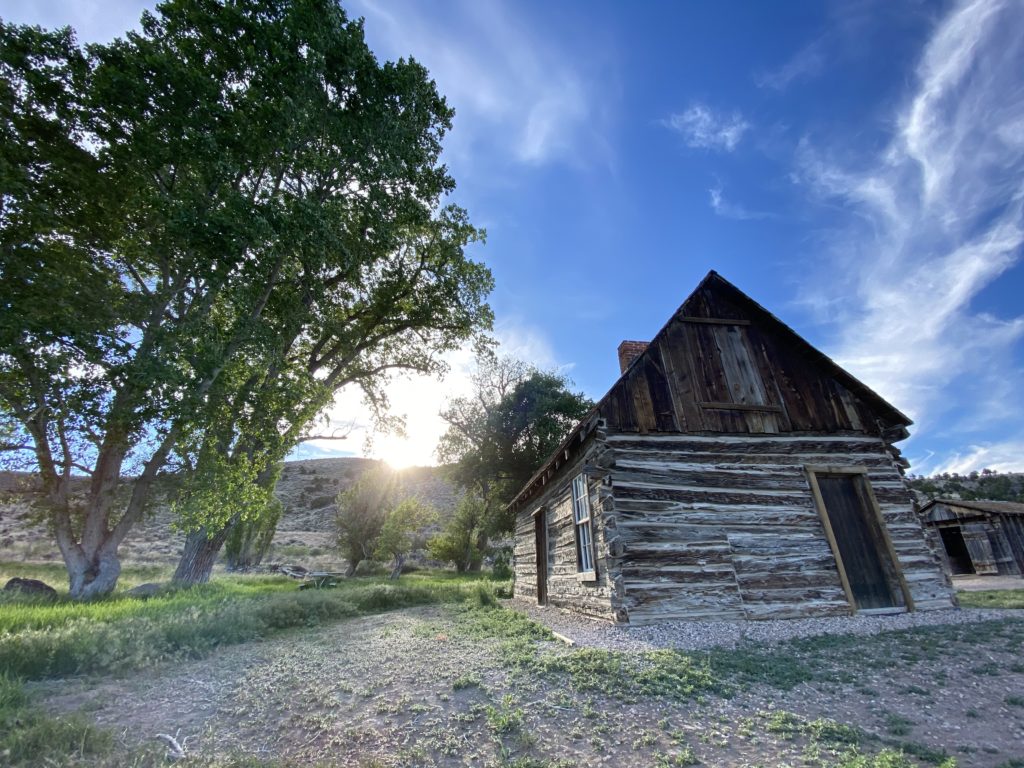 I saw a sign indicating that Butch Cassidy’s childhood home was coming up. I pulled over to check it out. It was typical of many other late 19th century log cabins that have been preserved – restored pioneer era furniture, some period clothing laying out, and a wall of plexiglass separating the display from the public. Fascinating, nonetheless, to be walking the same ground that such a notorious character grew up on. I took a few photos and then [ppp_patron_only level=”5″ silent=”no”]wandered into the back yard (which was just free growing grass and weeds among some large old trees). I felt the urge to pee.