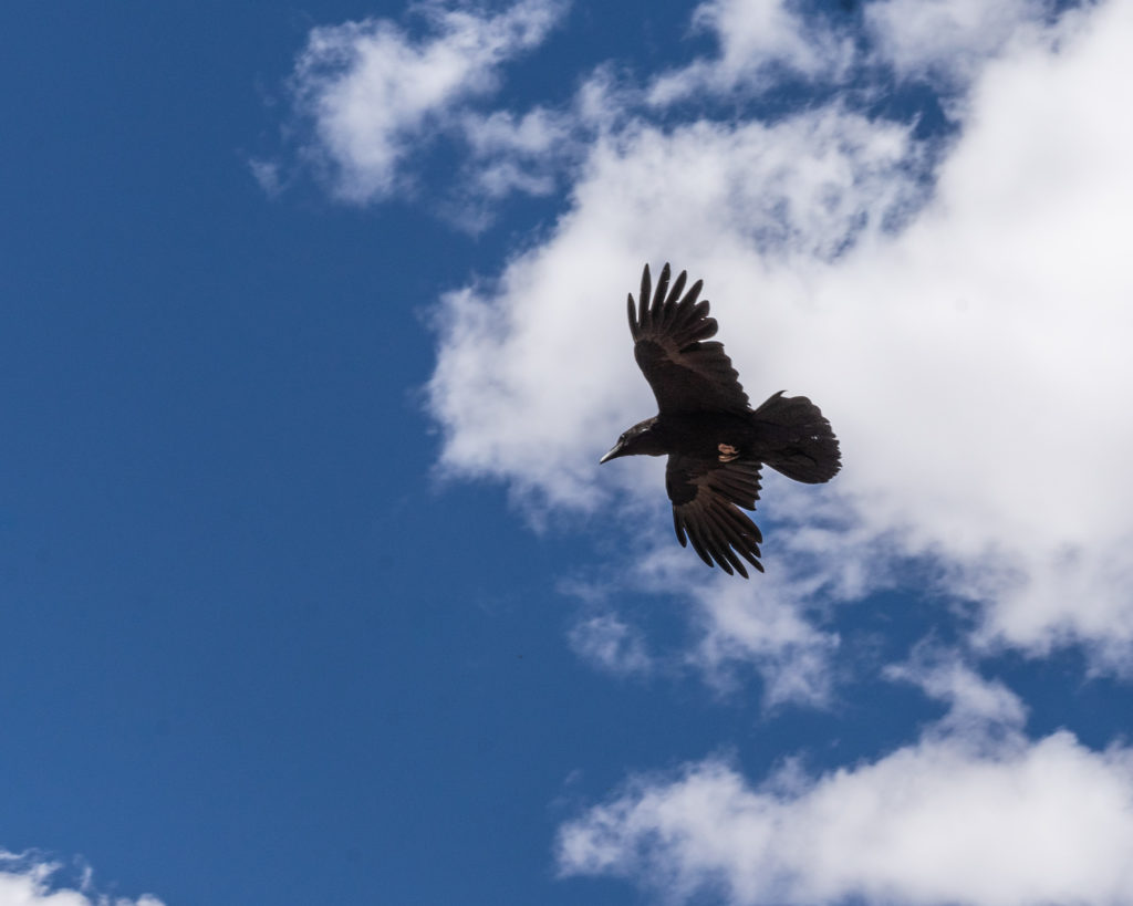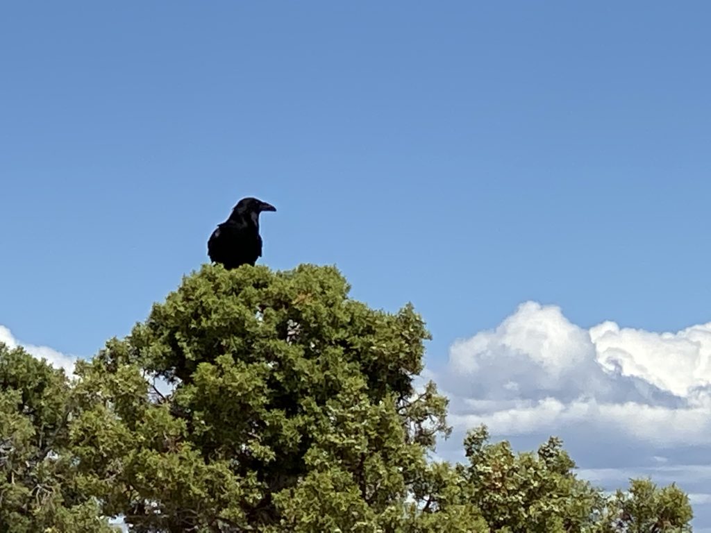 Immediately upon arriving, a raven circled around and perched itself in a tree next to my bike, as if to greet me. It stayed long enough for a picture, then left.