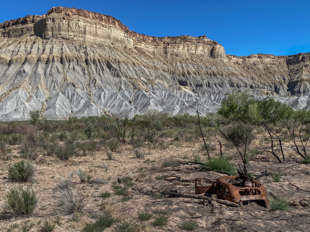 Ephraim is buried in a town called Caineville, in the Capital Reef area. Caineville is made up of a few houses along route 24. Half of them are abandoned. It’s hard to imagine why anyone lives here and what they do to get by. I eventually found a promising sign: