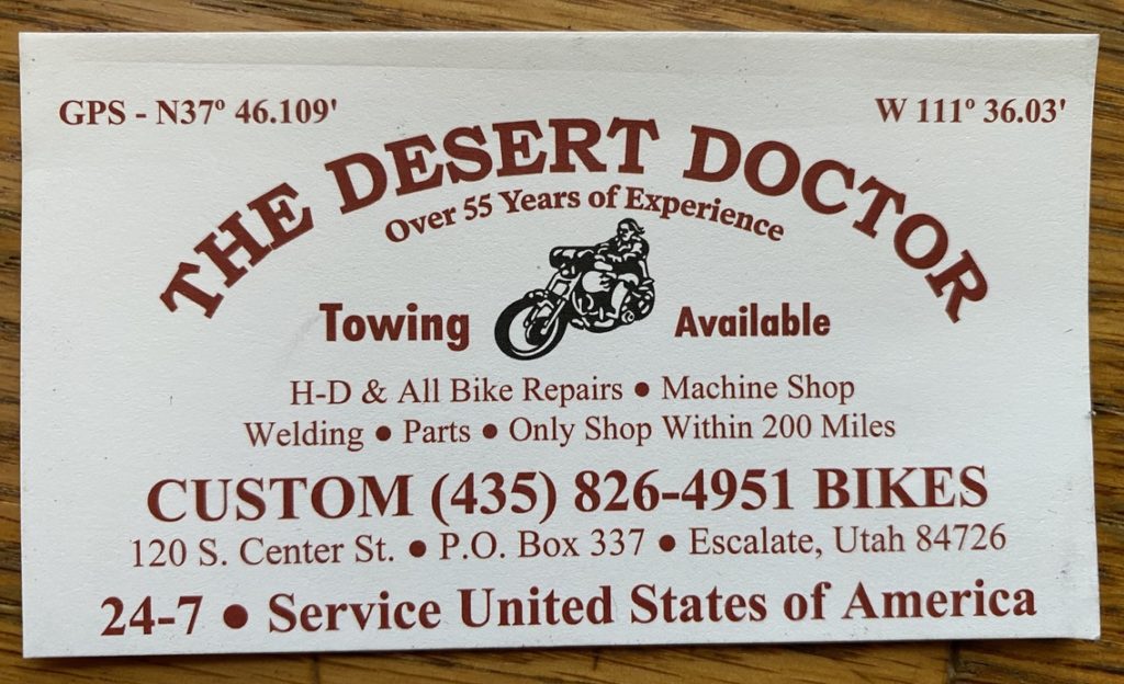 Prior to my first Southern Utah run, one of my seasoned biker friends, Doug, told me about a guy who you can call if you ever have any bike problems. “He” doesn’t have a name, exactly. Doug called him some kind of ‘motorcycle doctor’.