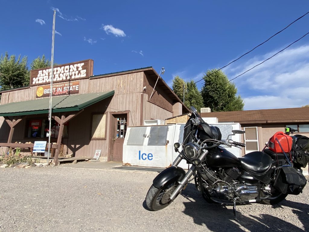 We put our kickstands down, peeled off leathers and helmets. Pat went inside to survey the refreshment offerings of Antimony Mercantile. He emerged with a cold beer for him and Char.