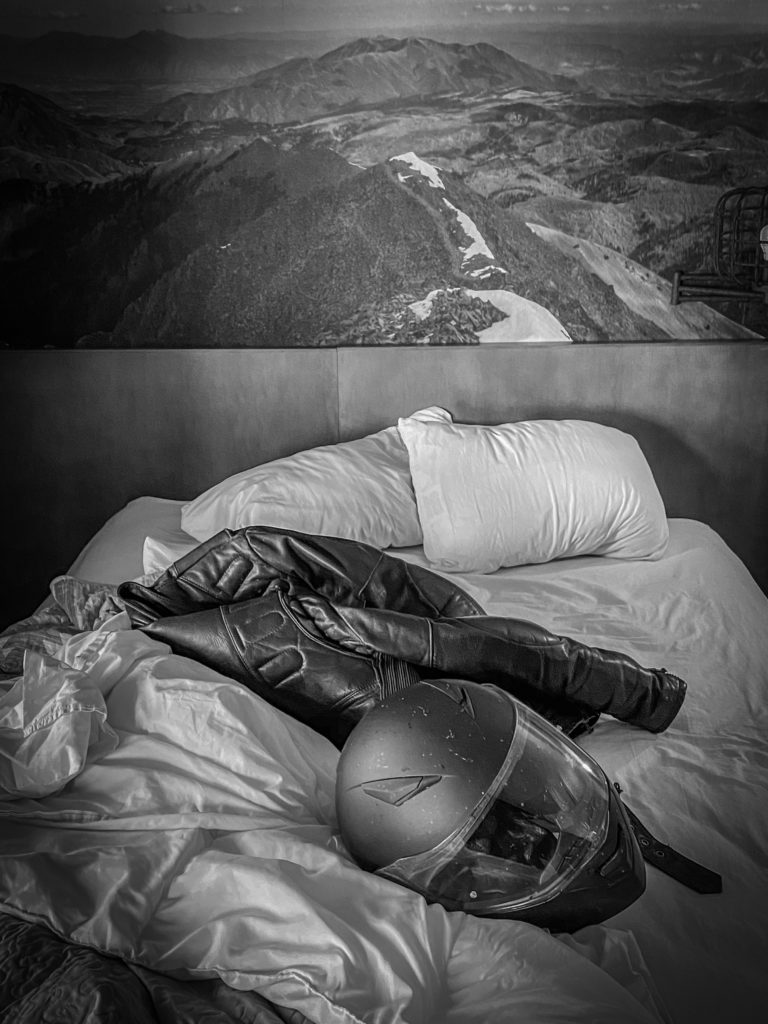 I stood up to begin my pre-ride rituals: locate gloves, keys in ignition, check out fuel levels, ensure saddles bags are closed up, put on my jacket…